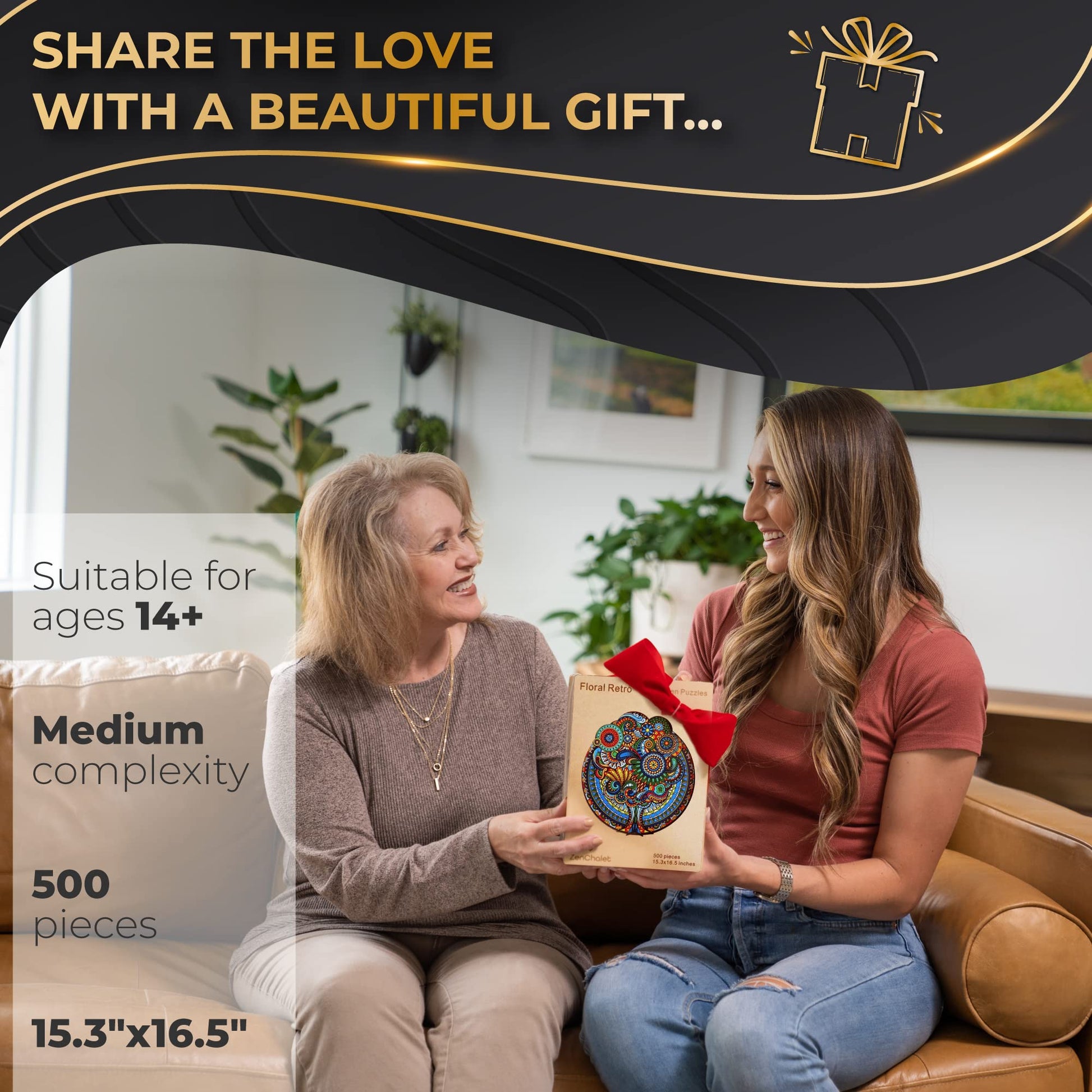 Zenchalet Floral Retro 500 Piece Wooden Jigsaw Puzzle For Adults - Uniquely Shaped Pieces With Durable Wood Construction - Perfect For Birthday Gifts, Game Nights, And Family Presents