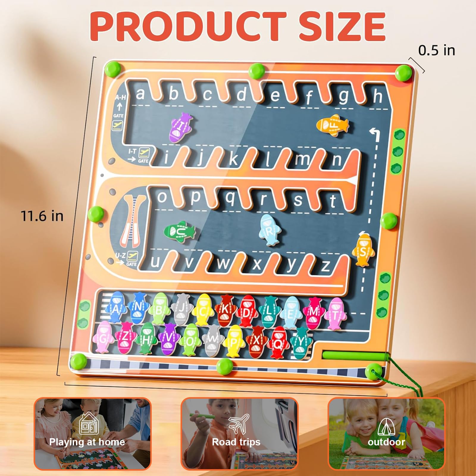 Educational and Interactive: The magnetic alphabet letter maze toy is a fun and engaging way for children to learn about letters; With its colorful design and magnetic letters; kids can enjoy hours of educational playtime | Safe and Durable: The montessori maze toy is made of high-quality materials that are safe for children; The magnetic letters are securely attached to the surface; ensuring they won't get lost easily; The toy is built to withstand rough play and is durable enough to last for a long time; providing endless hours of learning and entertainment | Portable and Compact: The magnetic letter maze toy is designed to be portable and compact; It can be easily carried around; making it a great on-the-go toy for long car rides, trips, or even for use at home; The compact size also ensures easy storage when not in use | Maze Design: The wooden toy features a maze with various paths and obstacles; Children have to navigate the magnetic letters through the maze; finding the correct path to complete words or reach a specific target; It challenges their problem-solving skills and spatial awareness | Perfect Toy Idea: The magnetic alphabet puzzle board is a great toy idea for kids and toddlers; Perfect toy idea for Christmas, Halloween, New Year, birthdays, holidays, travel and other special occasions