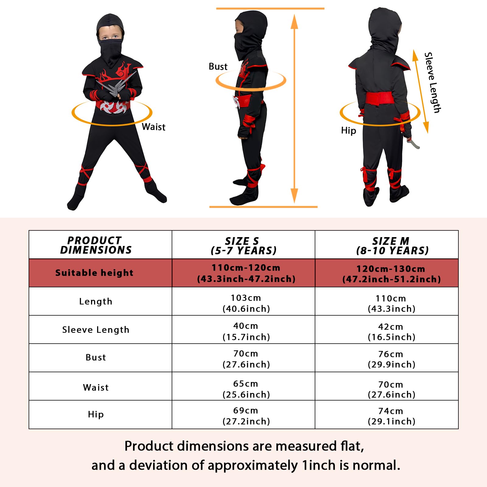 ransform playtime into an epic ninja adventure with this Kids Ninja Costume Set with 7 Safe Plastic . The complete set includes a black ninja outfit with red flame details matching hood and belt plus 7 plastic : katana decorative replica blade sais kunai and tossing stars. Everything your little warrior needs to feel like a real ninja!Designed with child safety in mind all are made from lightweight durable plastic with smooth edges-no sharp points no risks. Parents can relax knowing kids can enjoy safe action-packed role play.This versatile costume is perfect for Halloween trick-or-treating cosplay parties school plays themed birthdays or everyday dress-up fun. The breathable fabric ensures all-day comfort while the flexible design lets kids move freely as they sneak jump and play.Give your child the ultimate ninja experience with this fun and safe costume set-perfect for sparking imagination boosting confidence and creating unforgettable memories.