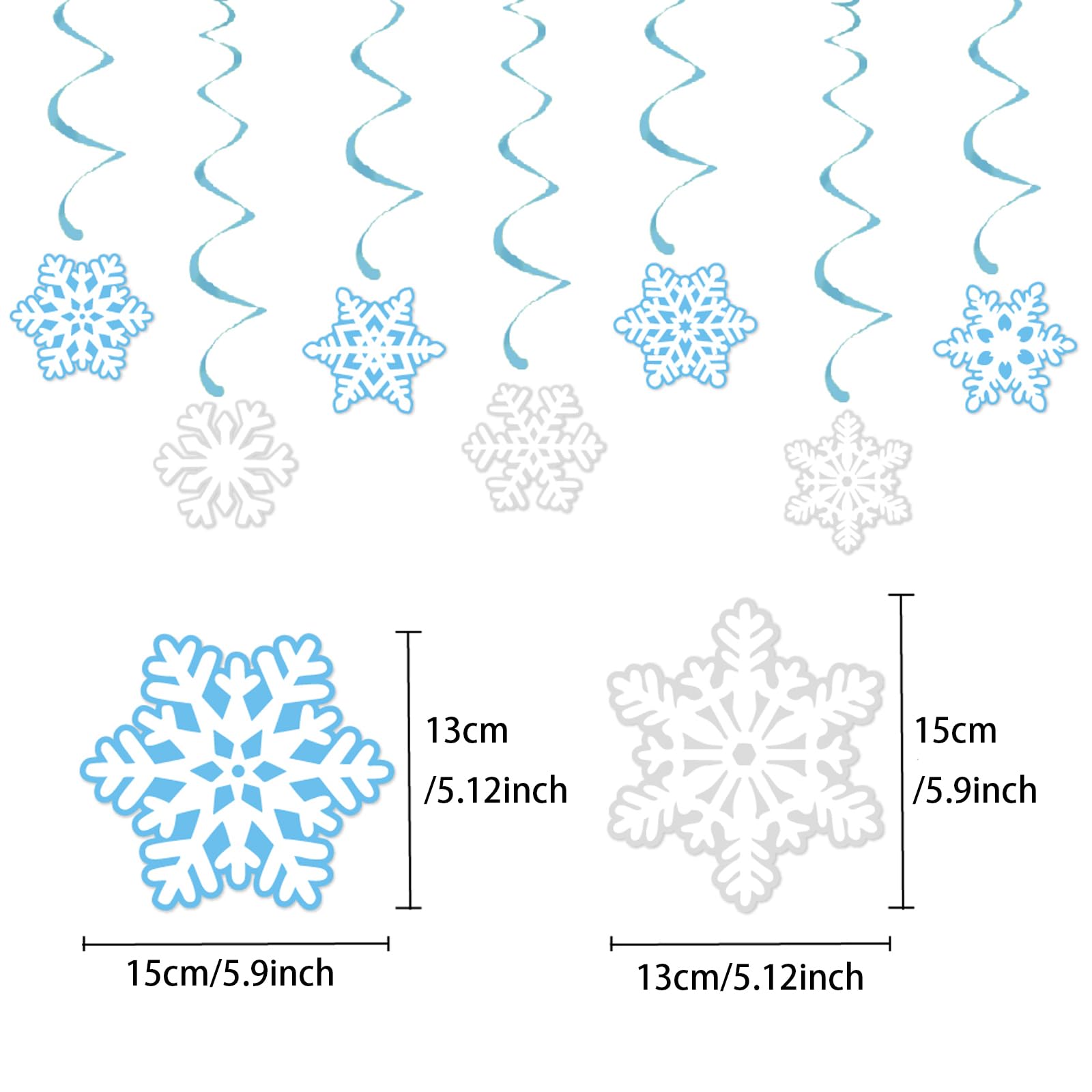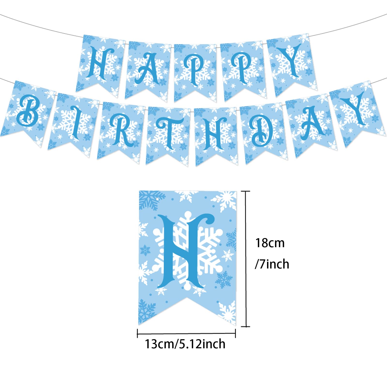 - Q: What is included in the Zwiebeco Blue White Snowflakes Happy Birthday Party Decoration Set? A: The set includes a blue white snowflakes happy birthday banner, two white strings (each 3m/9.8ft, totaling 6m/19.6ft), one threading needle, and seven hanging snowflakes swirls (four blue white snowflakes and three silver white snowflakes in different shapes), along with some swirl accessory hooks.