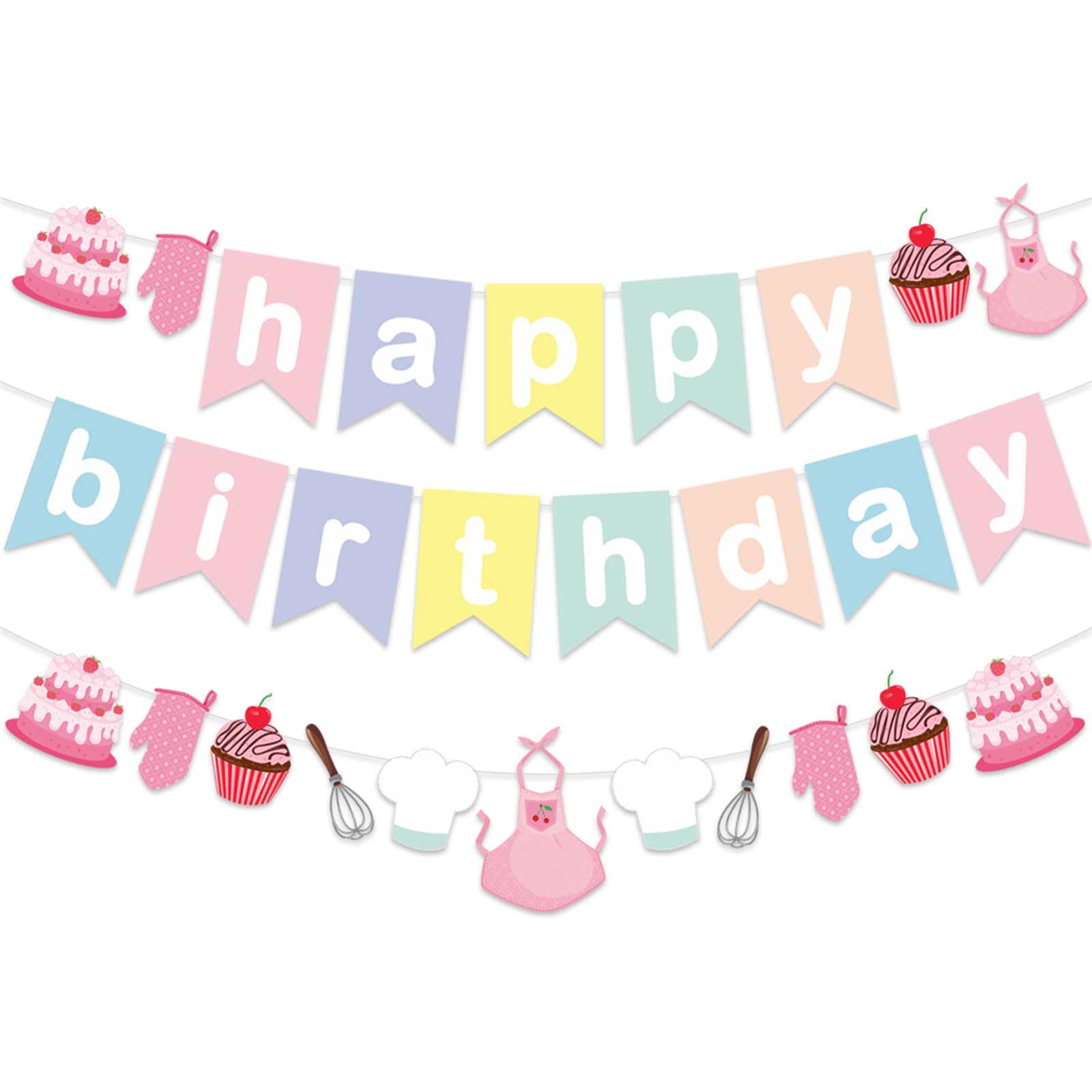 - Q: What is included in the Zwiebeco Baking Happy Birthday Banner kit? A: The Zwiebeco Baking Happy Birthday Banner kit includes one colorful pink paper happy birthday banner, one pink bake banner bunting garland, three pieces of strings (each 3m/9.8ft for a total of 9m/29.4ft), and two threading needles.
