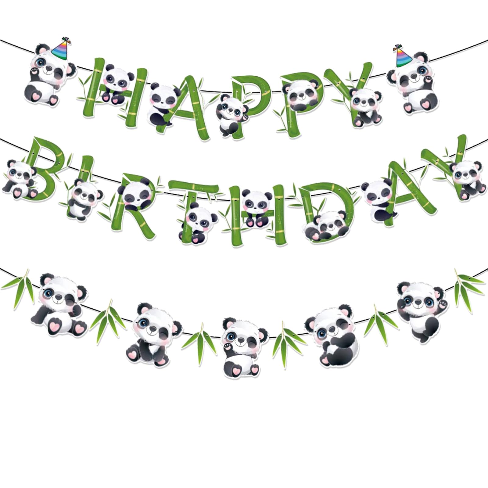 - Q: What is included in the Zwiebeco Pandas Happy Birthday Party Decoration set? A: The set includes a green black white paper cute pandas happy birthday banner, a bamboo leaves cute pandas banner bunting garland, three strings (each 3m/9.8ft, totaling 9m/29.4ft), and two threading needles.