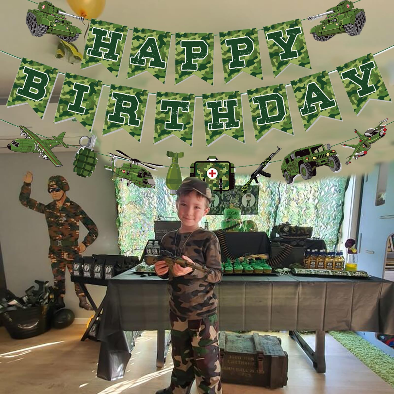 - Q: What is included in the Zwiebeco Green Camo Birthday Decoration package? A: The package contains one green camo paper happy birthday banner, one green camouflage patterns banner bunting garland, three strings (each string is 3m/9.8ft, totaling 9m/29.4ft), and two threading needles for easy assembly.